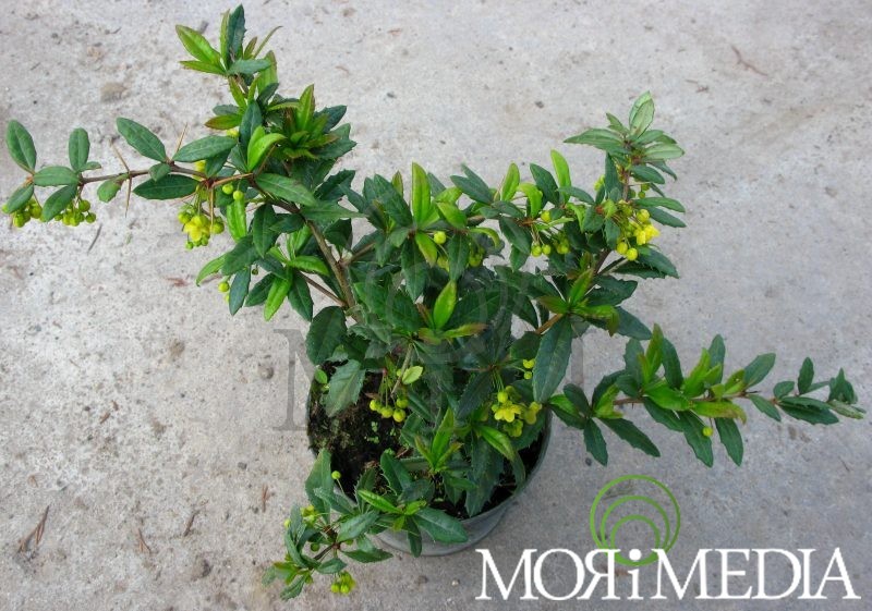 Ciernisty, zimozielony krzew dorastający do: 3m wys. i 2,5m szer. Liście ciemnozielone. Kwiaty żółte (V). Owoce granatowe (VIII-IX). Preferuje stanowiska słoneczne i półcieniste. pH gleby: tolerancja.
