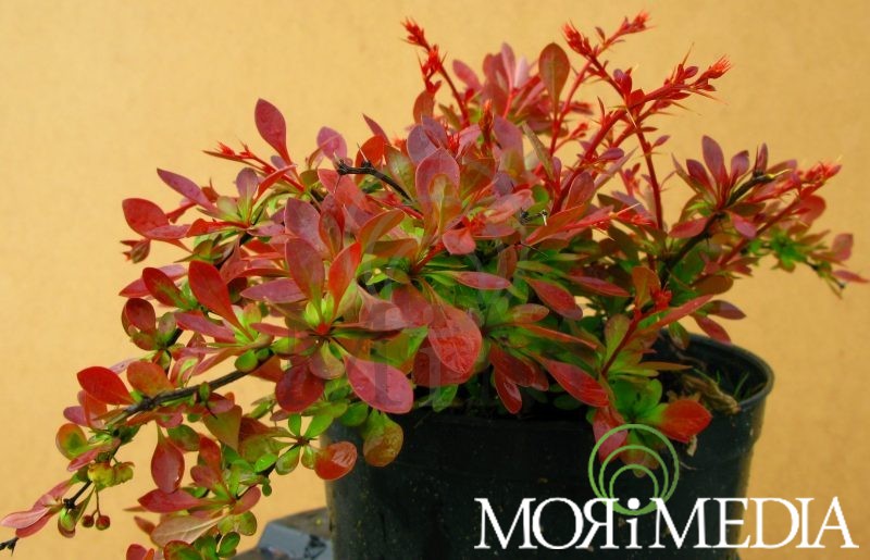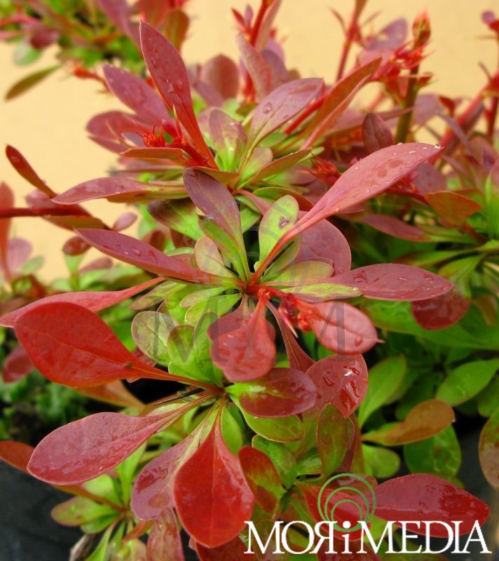 Krzew dorastający do 1m wys. Liście purpurowoczerwone ze złotozielonym obrzeżem. Opadają na zimę. Kwitnie na żółto na przełomie V/VI. Owoce czerwone(VIII-IX). Wymaga stanowisk słonecznych. pH gleby: tolerancja.