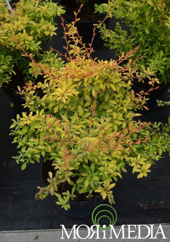Kulisty krzew o przewieszających się pędach dorastający do 1,5m średnicy. Młode liście czerwone, później złote. Młode pędy różowoczerwone. Preferuje stanowiska słoneczne i półcieniste. pH gleby: tolerancja.