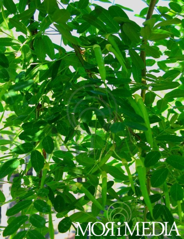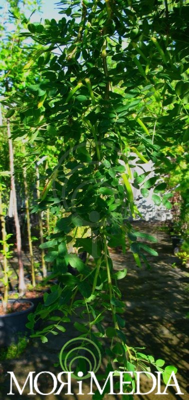 Krzew o pokroju przewieszającym się. Wysokość rośliny zależna od wysokości szczepienia. Liście jasnozielone, opadające na zimę. Kwiaty żółte (V). Preferuje stanowisko słoneczne, osłonięte. Optymalne pH gleby: tolerancja.