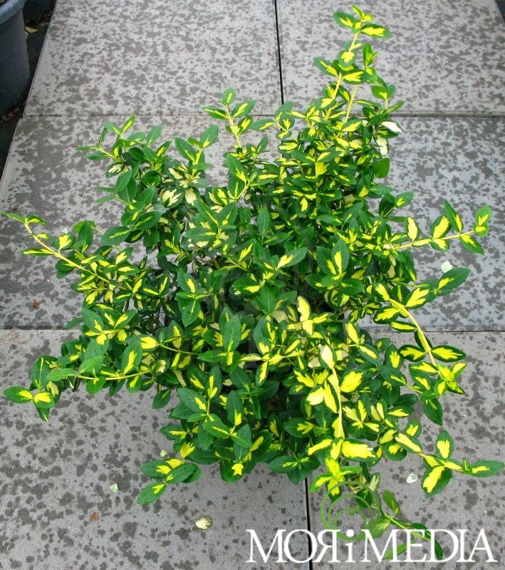 Gęsty krzew zimozielony z pokładającymi się pędami. Dorasta do 0,3 m wys. Liście kremowożółte z wąskim zielonym obrzeżeniem. Daje sobie radę zarówno na stanowiskach słonecznych jak i półcienistych. pH gleby: tolernacja. Lubi gleby wilgotne.