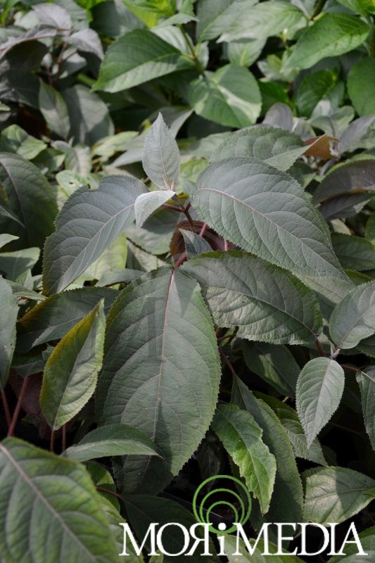 Krzew dorastający do 2 m wys. i szer. Liście szorstkie, purpurowozielone. 20-centymetrowe kwiatostany składające się z dwóch rodzajów kwiatów: fioletowoniebieskich kwiatów wewnątrz i jasnofioletowych kwiatów na zewnątrz kwiatostanu (VIII-IX). Preferuje stanowiska półcieniste. Lubi gleby wilgotne o pH lekko kwaśnym.