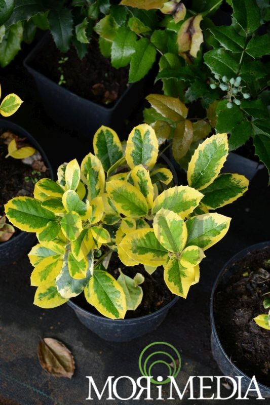Roślina zimozielona dorastająca do 5m wys. i 3m szer. Liście ciemnozielone żółtoobrzeżone. Kwitnie na biało (V). Jesienią pojawiają się czerwone owoce. Preferuje stanowiska osłonięte, słoneczne. pH gleby: tolerancja. Roślina nadająca się do cięcia, formowania. Należy okrywać w mroźniejsze zimy.