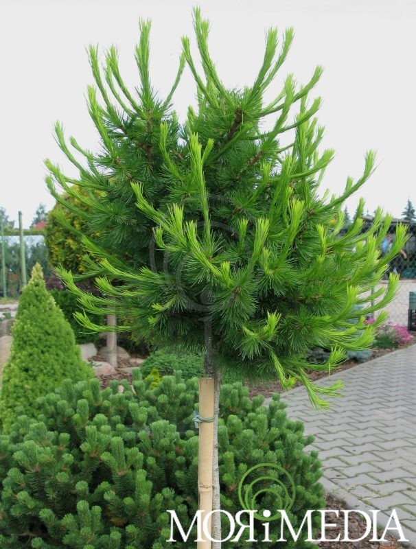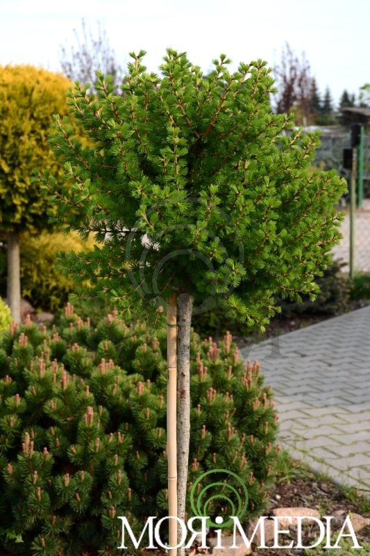 Krzew o pokroju kulistym dorastający w ciągu 10 lat do: 1 m szer. Wysokość uzależniona od miejsca szczepienia. Igły zielone, sezonowe, opadające na zimę. Preferuje stanowiska słoneczne i gleby umiarkowanie wilgotne, przepuszczalne. Optymalne pH gleby: kwaśne.