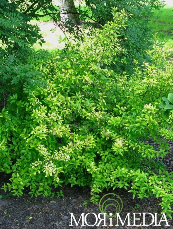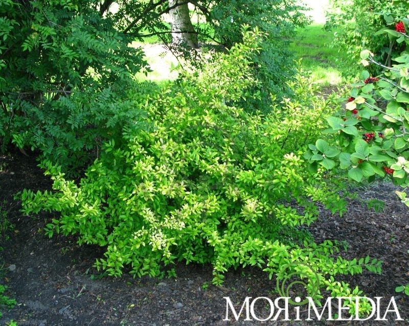 Roślina o krzewiastym pokroju. Dorasta do: 3m wys. i szer. Liście wiosną złote, później złotozielone. Kwiaty białe (VI-VII). Owoce czarne. Lubi stanowiska słoneczne i półcieniste. Optymalne pH gleby: tolerancja. Roślina odporna na zanieczyszczenie powietrza.