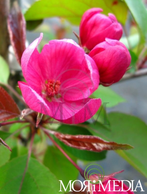 Rozłożyste drzewo dorastające do 6m wys. Liście błyszczące, jajowate, czerwonopurpurowe, jesienią czerwone. Kwiaty ciemnoróżowe, pachnące (V). Owoce ciemnoczerwone, niejadalne (VIII-X). Preferuje stanowiska słoneczne. Optymalne pH gleby: tolernacja.
