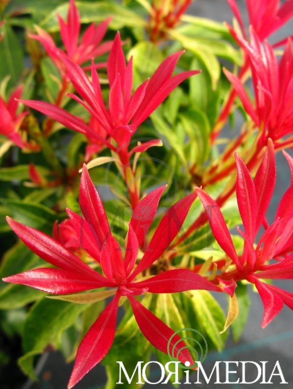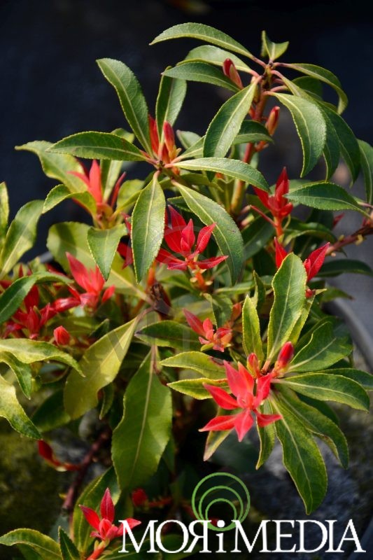 Zimozielony, kulisty krzew dorastający w ciągu 10 lat do1m wys i szer. Liście błyszczące, ciemnozielone. Bardzo atrakcyjne młode przyrosty: intensywnie czerwone, zmieniające kolor na różowy, później kremowy i zielony. Kwiaty białe (IV-V). Lubi stanowiska ciepłe, osłonięte, słoneczne(lekko zacienione) i półcieniste. Optymalne pH gleby: kwaśne. Podłoże wilgotne. Młode egzemplarze należy okrywać na zimę.