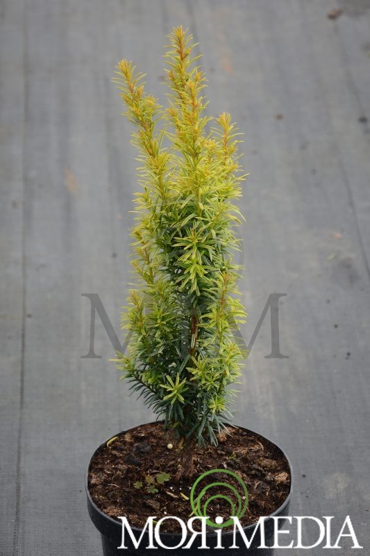 Odmiana żeńska o pokroju kolumnowym, z pędami skierowanymi pionowo ku górze. Igły zielone żółtoobrzeżone, młode przyrosty żółte. Odmiana pokrywająca się z końcem lata czerwonymi owocami. W ciągu 10 lat dorasta do 1,2m wys. i 0,4m szer. Stanowiska słoneczne, półcieniste. Optymalne pH gleby: lekko kwaśne. Lubi gleby żyzne, umiarkowanie wilgotne i przepuszczalne.