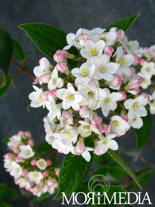 Krzew dorastający do 2m wys. i szer. Liście ciemnozielone. Kwiaty w pąkach różowe, po rozwinięciu białe (V). Kwiatostany kuliste o średnicy ok. 10cm. Preferuje stanowiska słoneczne i półcieniste. Optymalne pH gleby: lekko kwaśne. Lubi gleby umiarkowanie wilgotne.