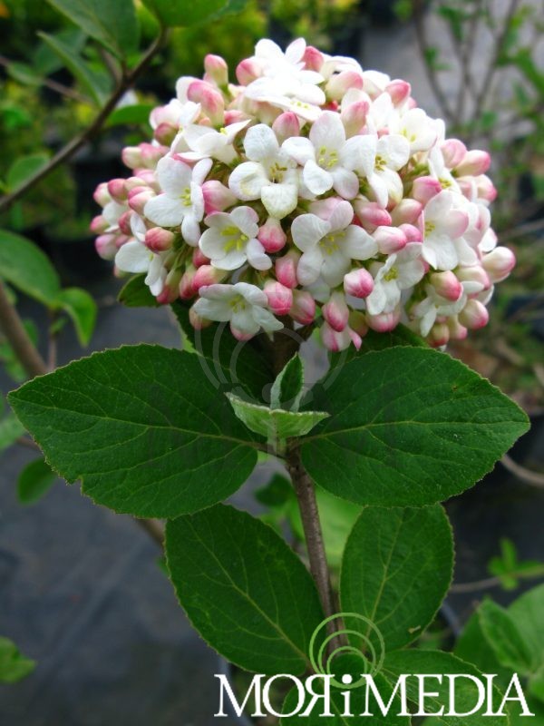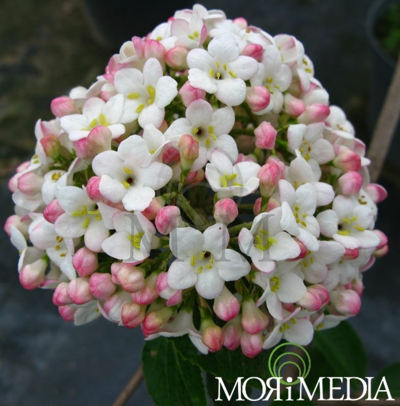 Krzew dorastający do 2,5m wys. i szer. Liście ciemnozielone. Kwiaty w pąkach ciemnoróżowe, po rozwinięciu białe (V-VI). Kwiatostany kuliste o średnicy ok. 12cm. Preferuje stanowiska słoneczne i półcieniste. Optymalne pH gleby: lekko kwaśne. Lubi gleby umiarkowanie wilgotne.