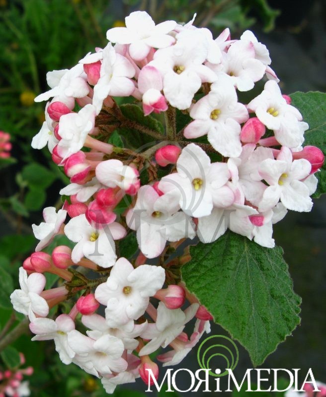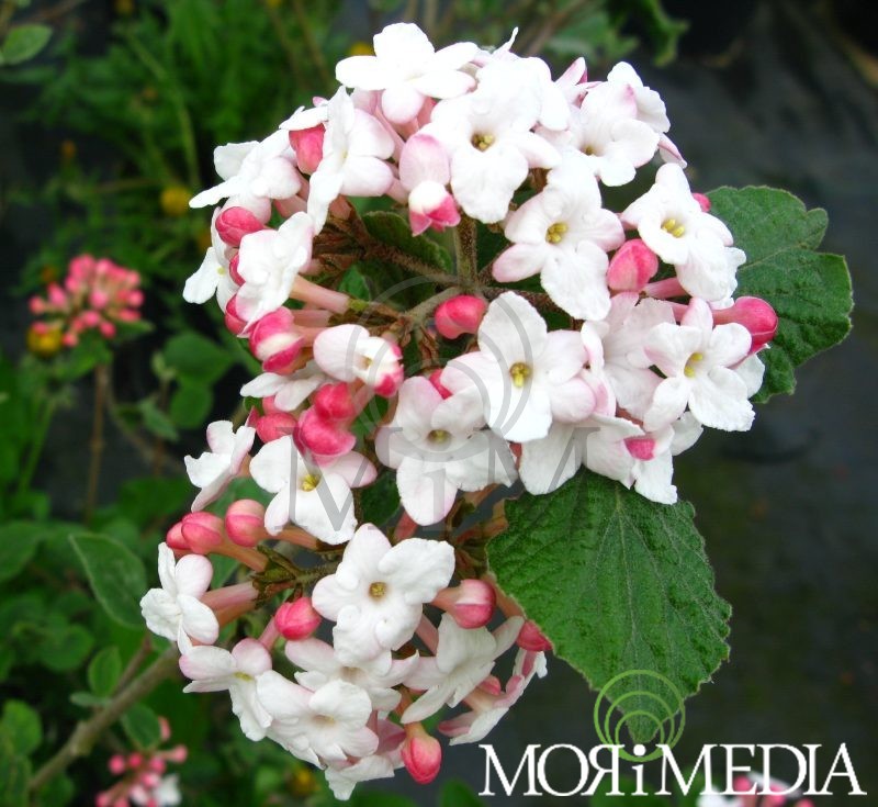 Krzew dorastający do 1,5m wys. i szer. Liście ciemnozielone. Kwiaty w pąkach różowe, po rozwinięciu białe (IV-V). Kwiatostany kuliste o średnicy ok. 8cm. Preferuje stanowiska słoneczne i półcieniste. Optymalne pH gleby: lekko kwaśne. Lubi gleby umiarkowanie wilgotne.