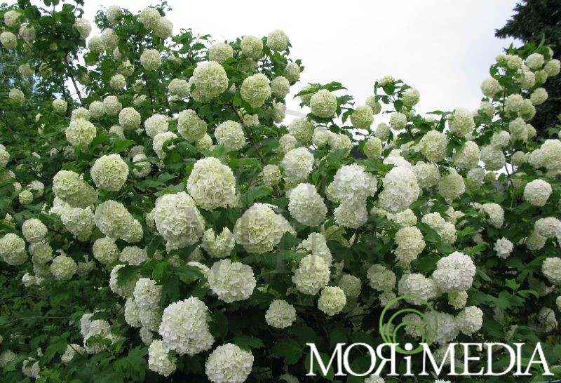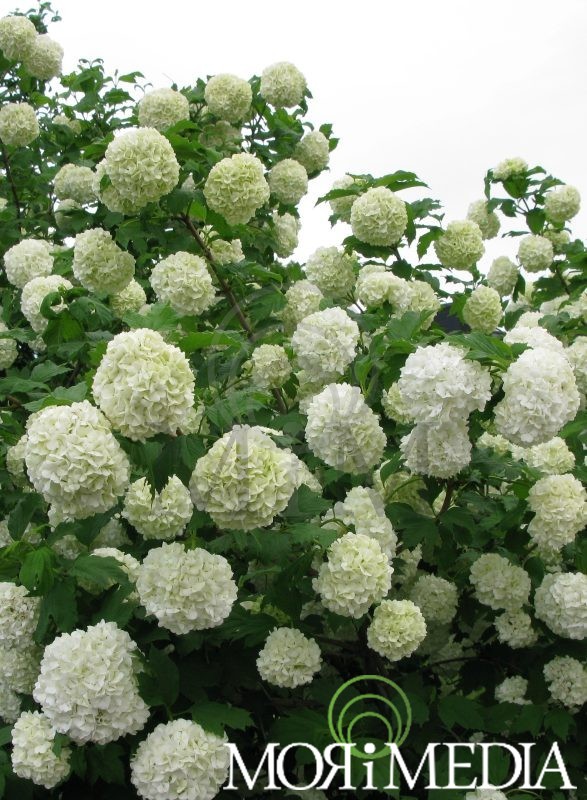 Krzew dorastający do 4m wys. Liście jasnozielone. Kwiaty w pąkach różowe, po rozwinięciu białe (V). Kwiatostany kuliste o średnicy ok. 15cm. Preferuje stanowiska słoneczne i półcieniste. Optymalne pH gleby: tolerancja. Lubi gleby wilgotne.