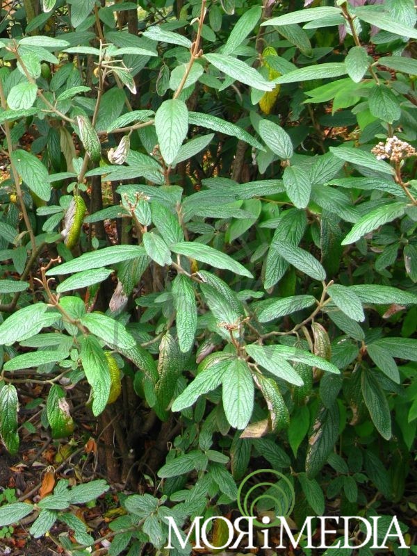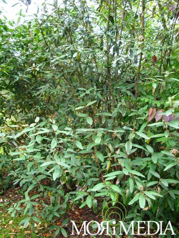 Zimozielony krzew dorastający do 3m wys. i szer. Liście ciemnozielone. Kwiaty białe (V-VI). Kwiatostany talerzykowate. Preferuje stanowiska półcieniste i cieniste. Optymalne pH gleby: tolerancja. Lubi gleby umiarkowanie wilgotne.